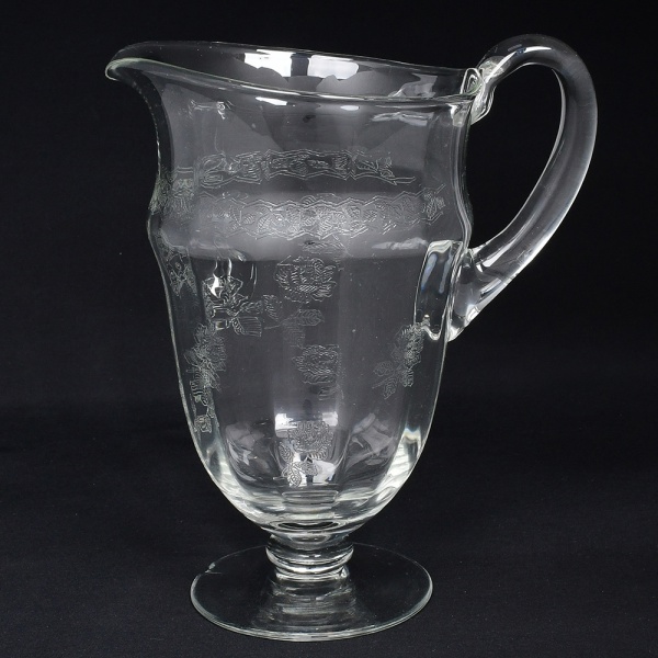 • Belíssima jarra executada em cristal europeu, diáfano e incolor; bojo oval alongado, bico vertedor ondulado e revirado para fora, alça lateral curvada e aplicada sobre a superície, fuste em anel sobre base circular; ricamente gravado com flores e faixa contínua de motivo vegetalista. Medidas: Alt.: x Diam.: