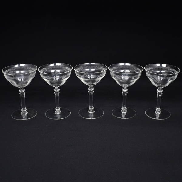 • Belíssimo conjunto de taças de pé alto, para champanhe, executado em cristal europeu, diáfano e incolor; bojo campaniforme, borda ligeiramente evertida, gravado com flores e faixa contínua de motivo vegetalista , haste tubular com anel intermediário e base circular. Composto de cinco(05) unidades. Medidas: Alt.: x Diam.: