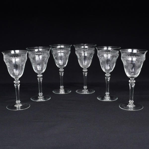 • Belíssimo conjunto de taças de pé alto, para ....., executado em cristal europeu, diáfano e incolor; bojo obcônico, borda ligeiramente evertida, gravado com flores e faixa contínua de motivo vegetalista, haste tubular com anel intermediário e base circular. Composto de seis(06) unidades. Medidas: Alt.: x Diam.: