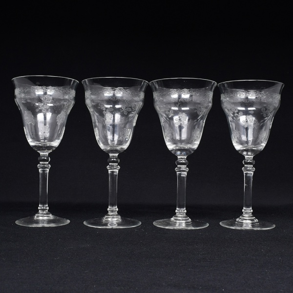 • Belíssimo conjunto de taças de pé alto, para ....., executado em cristal europeu, diáfano e incolor; bojo obcônico, borda ligeiramente evertida, gravado com flores e faixa contínua de motivo vegetalista , haste tubular com anel intermediário e base circular. Composto de quatro(04) unidades. Medidas: Alt.: x Diam.: