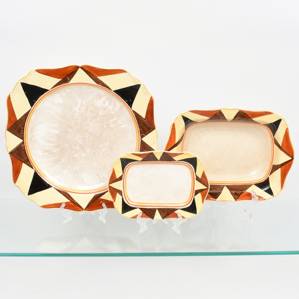 • J & G Meakin, Staffordshire - Inglaterra(Fundada em 1851). Duas(02) travessas(uma funda e uma rasa) e um(01) prato de serviço em faiança inglesa da década de 1930, padrão "SOL". Formatos retangular e quadrangular, de quinas levemente chanfradas, bordo recortado em ondulações; esmaltação de tom marfim, dotado de rica decoração Art Déco, contendo composição geométrica radial na aba, formada por reservas triangulares alternadas em esmalte de tonalidade preta, marrom e amarelo-creme, dispostas em sequência contínua. Centro circundado por frisos concêntricos em tom laranja e mostarda, este último se replica no contorno da borda. Marca da manufatura no verso. Medidas: Travessas: Alt.: 5,5 x Comp.: 26 x Larg.: 19 cm; Comp.: 19,5 x Larg.: 14 cm. Prato de serviço: Diam.: 30 cm. Estado de conservação conforme fotografias. Apresentam manchas do tempo e desgastes pontuais de uso, vide foto.