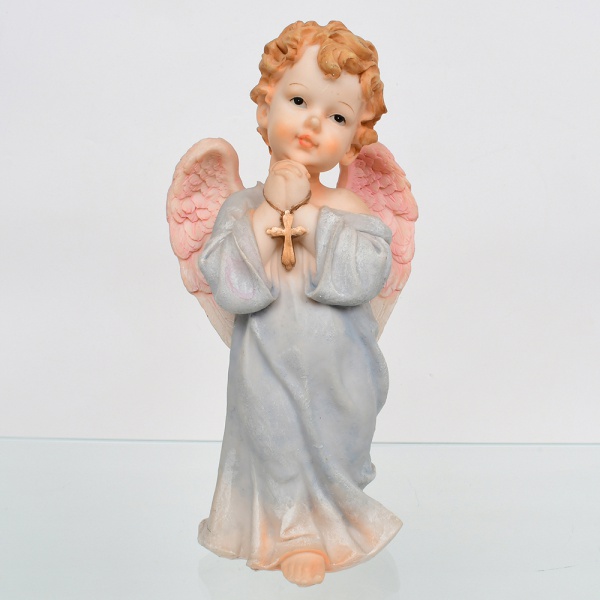 • Escultura em resina moldada e policromada, representando anjo infantil em gesto de oração, com mãos unidas junto ao peito, portando cruz pendente. Traja veste longa com modelagem em pregas, asas posteriores em policromia. Medidas: