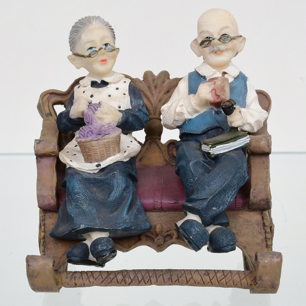 • Escultura em resina moldada e policromada, representando casal de idosos sentado em banco. Grupo escultórico com duas figuras em composição única, apoiadas sobre banco com encosto recortado. Figura feminina trajando vestido com avental, segurando cesta com novelo de lã e instrumento de tricô; figura masculina trajando camisa e colete, portando cachimbo e livro. Fisionomias caricaturais, com aplicação de óculos em relevo. Policromia aplicada sobre base clara, com variações tonais nas vestes e detalhes. Medidas
