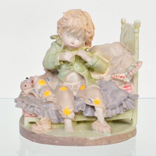 • Escultura em resina policromada representando criança sentada em leito, em composição narrativa doméstica, com vestes em tons pastéis e elementos têxteis simulados (almofada e colcha), base oval integrada ao conjunto. Medidas: