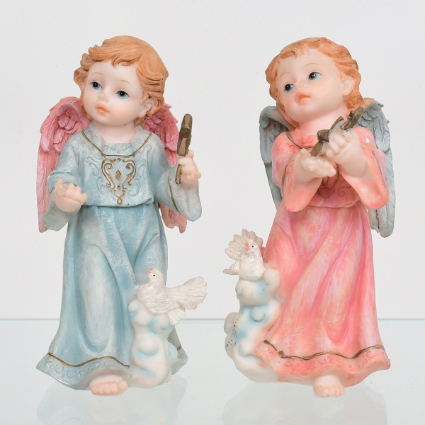 • Duas(02) esculturas em resina moldada e policromada, representando figuras de anjos, apoiadas sobre base integrada em forma de nuvens, com elementos figurativos de aves. Um exemplar trajando veste azul com detalhes em douração e segurando estrela; outro com veste em tonalidade rosa, portando instrumento musical. Asas posteriores em policromia contrastante. Medidas: