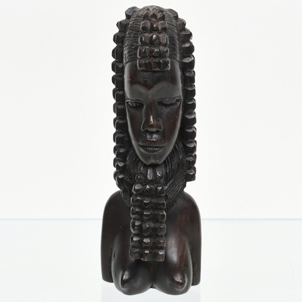 • Escultura em madeira representando busto feminino estilizado, de inspiração africana, com traços geometrizados, penteado em tranças segmentadas; composição associada a repertórios formais da África Ocidental, sem atribuição específica. Medidas: