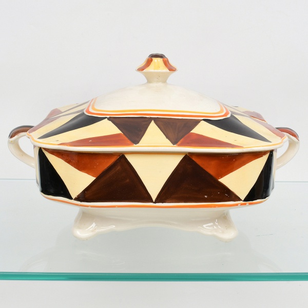 • J & G Meakin, Staffordshire - Inglaterra(Fundada em 1851). Sopeira em faiança inglesa da década de 1930, padrão "SOL". Formato quadrangular, de quinas levemente chanfradas, bordo recortado em ondulações, tampa ligeiramente abaulada, puxador com feitio de pião, alças laterais curvadas, vazadas e modeladas em forma de concha estilizada, assente sobre quatro pés levemente revirados; esmaltação de tom marfim, dotado de rica decoração Art Déco, contendo composição geométrica radial, formada por reservas triangulares alternadas em esmalte de tonalidade preta, marrom e amarelo-creme, dispostas em sequência contínua. Centro e borda inferior circundados por frisos concêntricos em tom laranja e mostarda, este último se replica no contorno da borda da tampa. Marca da manufatura no verso. Medidas: Alt.: 18 x Comp.: 29 x Larg.: 22 cm. Estado de conservação conforme fotografias. Apresenta desgastes pontuais de uso, vide foto.