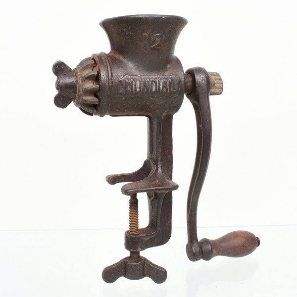 • Moedor manual de alimentos em ferro fundido, com corpo monobloco e funil superior troncônico, marcado em relevo com a inscrição MUNDIAL e numeração 2. Sistema de moagem por rosca helicoidal interna e conjunto de corte frontal com faca e disco perfurado, fixados por anel rosqueado. Acionamento por manivela lateral em eixo metálico, com pega em madeira torneada. Fixação por grampo inferior com parafuso de aperto, para montagem em borda de mesa. Trabalho de produção industrial, destinado ao uso doméstico.Apresenta sinais de uso, com oxidação superficial, pátina do tempo e desgaste nas partes móveis e na pega de madeira. Medidas: