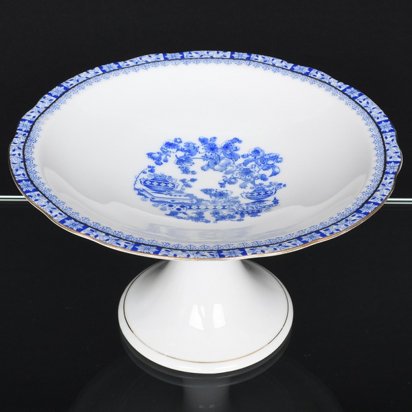 • ROSSLAU - ALEMANHA. Exuberante fruteira de pedestal em porcelana alemã, formato circular de interior ligeiramente côncavo, contorno recortado com aba larga levemente ondulada, apoiado sobre base alta de formato cônico. Esmaltação branca, decoração apresenta composição em azul padrão china-blau, característica da tradição decorativa centro-europeia inspirada nas porcelanas orientais; aba ornada por friso contínuo em azul com motivos florais estilizados e elementos geométricos, delimitado por filete dourado acompanhando o contorno ondulado da borda, campo central apresenta vinheta decorativa em azul, composta por arranjo floral acompanhado de pequeno elemento ornamental representando ânfora sobre base. Marca na base em azul: CHINA-BLAU / ROSSLAU, indicando manufatura da fábrica Rosslau, Alemanha. Medidas: Alt.: 15 x Diam.: 25 cm.