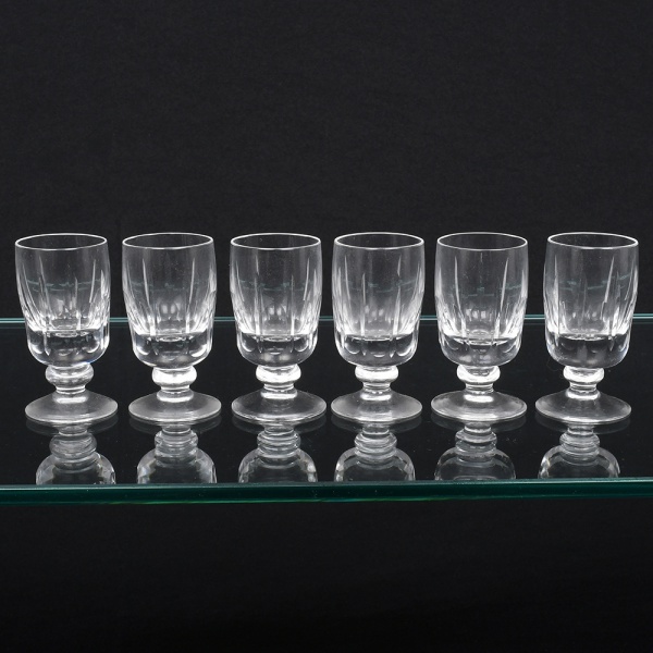 • Conjunto composto por seis(06) cálices em cristal incolor, apresentando bojo cilíndrico levemente abaulado, apoiado sobre haste curta com nó central e base circular, bojos decorados com lapidação geométrica composta por facetas verticais alongadas e cortes lineares. Medidas: Alt.: x Diam.: