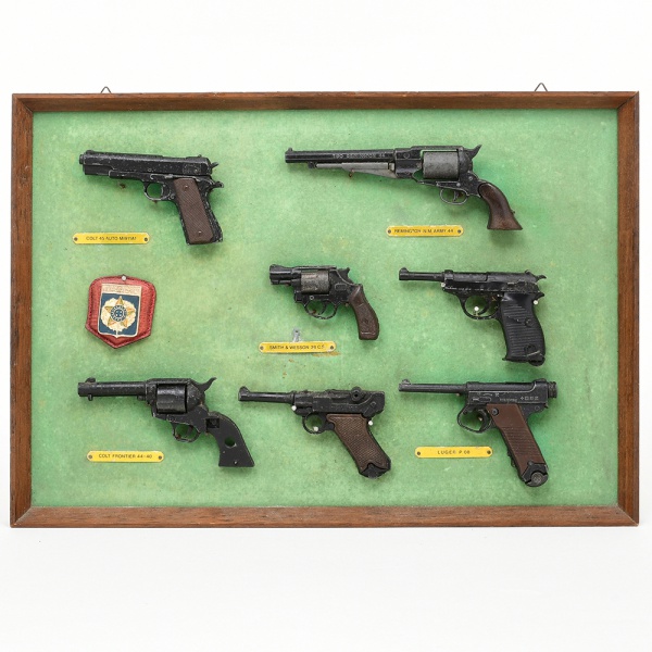 • MILITARIA. Quadro expositivo com conjunto de miniaturas de armas de fogo, fixadas sobre fundo revestido em tecido de cor verde, acondicionado em moldura retangular em madeira. Composição organizada com exemplares dispostos em alinhamento horizontal e vertical, acompanhados por plaquetas identificadoras metálicas, com inscrições como Colt .45 Auto M1911A1, Remington N.M. Army .44, Smith & Wesson .38, Colt Frontier .44-40 e Luger P.08. Inclui elemento heráldico aplicado, representando insígnia com a inscrição Brasil.Miniaturas em metal com empunhaduras em material sintético ou madeira, de caráter decorativo, fixadas por suportes metálicos.