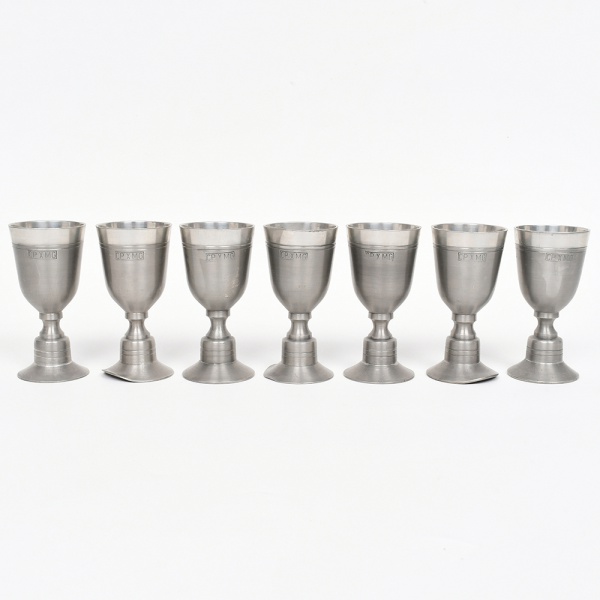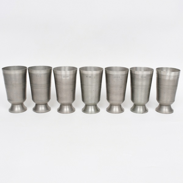 • Conjunto de cálices confeccionados em estanho, bojo cilíndrico, fuste torneado base campaniforme. Produção nacional da região de MG. Composto de sete(07) unidades. Medidas:
