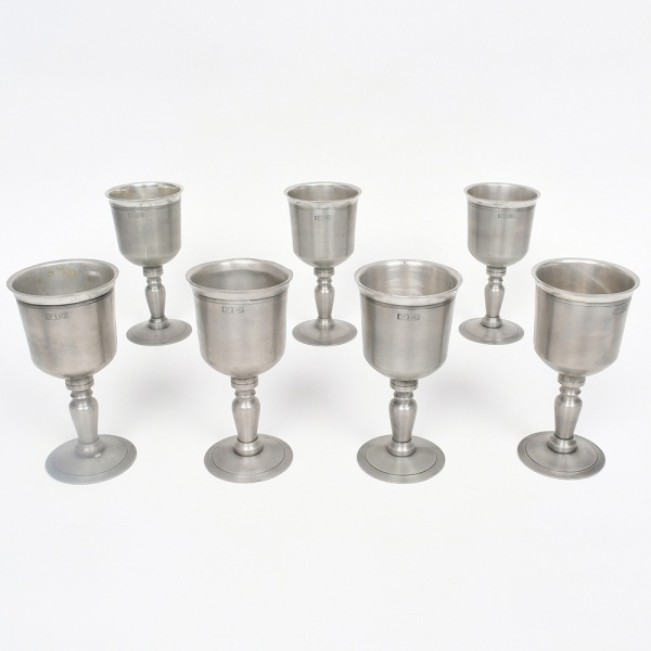 • Conjunto de cálices confeccionados em estanho, bojo oval, fuste afunilado sobre base campaniforme. Produção nacional da região de MG. Composto de sete(07) unidades. Medidas: