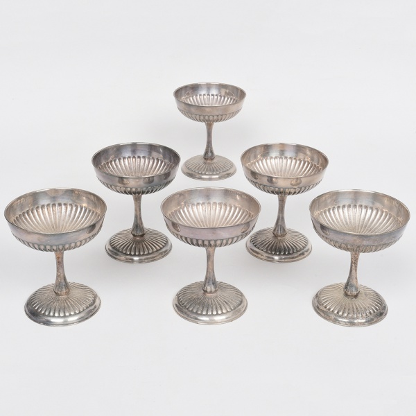• EBERLE. Conjunto de taças de pé alto para sobremesa, confeccionadas em metal espessurado à prata, bojo hemisférico repuxado com sucessão de gomos verticais, haste afunilada sobre base ligeiramente abaulada. Composto de seis(06) unidades. Necessita polimento e/ou refazer banho de prata. Medidas: