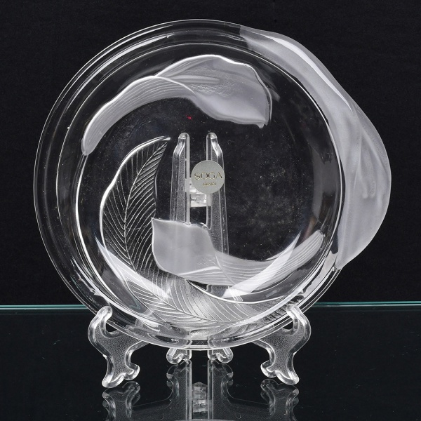 • Prato decorativo em vidro incolor moldado, de formato circular com borda irregular e aba assimétrica. Corpo com relevo interno representando motivo vegetal estilizado, composto por folha nervurada e elementos orgânicos curvilíneos, com áreas parcialmente acidadas, criando contraste entre superfícies foscas e polidas. Peça apoiada em base anelar discreta, integrada ao corpo. Etiqueta original do fabricante SOGA  Japan, indicando produção japonesa. Medida: