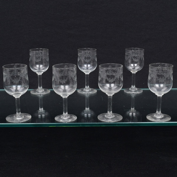 • Conjunto de taças em cristal francês, diáfano e incolor, para licor; bojo lavrado com faixa torcida suspendendo guirlanda de flores e laçarotes, fuste cilíndrico sobre base circular. Composto de sete(07) unidades. Medidas: Alt.: 11 x Diam.: 4,5 cm.