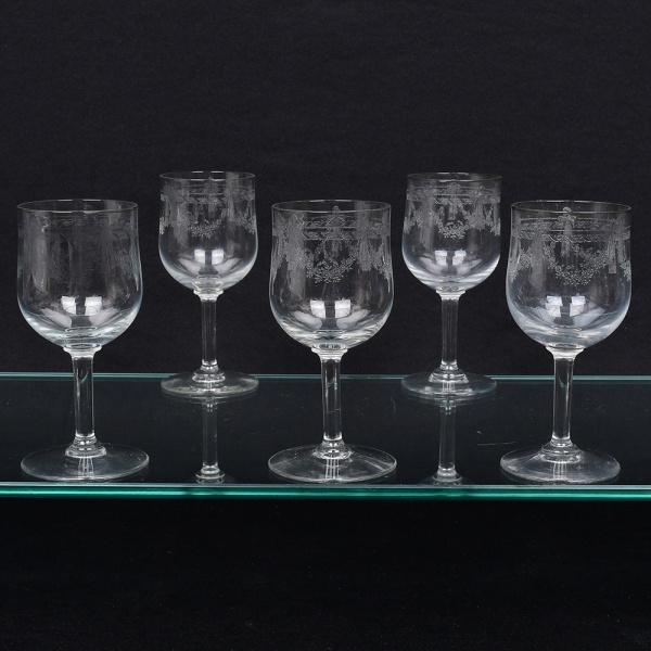 • Conjunto de taças em cristal francês, diáfano e incolor, para vinho tinto; bojo lavrado com faixa torcida suspendendo guirlanda de flores e laçarotes, fuste cilíndrico sobre base circular. Composto de cinco(05) unidades. Medidas: Alt.: 13,5 x Diam.: 5 cm.