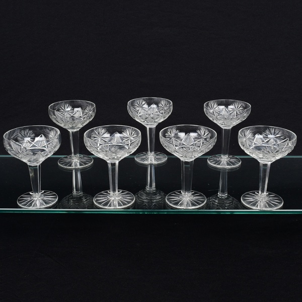 • Conjunto de taças de pé alto em cristal europeu, diáfano e incolor, para champanhe; bojo hemisférico dotado de profunda lapidação, contendo padrão de estrelas, sulcos, losangos e palmetas, haste sextavada, topo circundado por fileira de janelas ovais, apoiada sobre base circular, fundo preenchido por estrela raiada de dezesseis pontas. Composto de sete(07) unidades. Medidas: Alt.: 12 x Diam.: 9 cm.