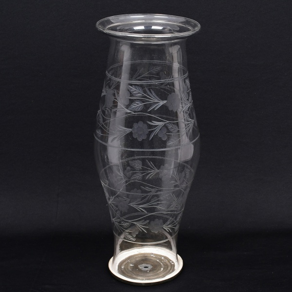 • Donzela em vidro incolor, corpo alongado com leve constrição central, boca alargada com borda revirada e base circular com reservatório inferior para vela. Execução em vidro soprado em molde, com acabamento de bordo ao fogo. Decoração gravada por roda (roda de cobre) com abrasivo, composta por motivos vegetalistas com ramos, folhas e flores estilizadas, dispostos em frisos helicoidais contínuos. Medidas: Alt.: 55 x Diam.: 73 cm.