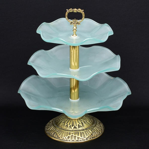 • Fruteira de três andares, composta por pratos em vidro moldado de tonalidade esverdeada, com bordas onduladas, montados em haste central metálica. Estrutura em metal com banho dourado, com base circular ornada em relevo e elemento superior em forma de alça vazada com motivos vegetalistas. Um prato apresenta pequeno trincado. Medidas: Alt.: 55 x Diam.: 47 cm.