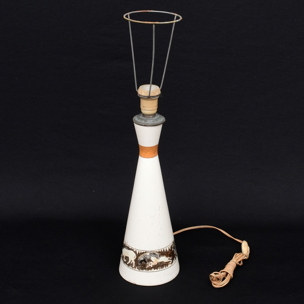 • Base de abajur em cerâmica esmaltada com elementos em metal; corpo em formato cônico alongado com base circular, esmaltação branca com faixa decorativa aplicada na porção inferior com representação de animais em paisagem, anel intermediário em acabamento metálico, soquete superior com suporte metálico para fixação de cúpula e instalação elétrica aparente; Estado conforme fotografias. Medidas: