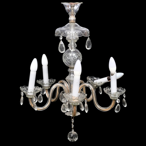 • Lustre de seis luzes em cristal e vidro, translúcido, com estrutura composta por hastes curvas, corpo central moldado e elementos pendentes em cristal lapidado; braços simétricos, bocais em forma de tulipa com pingentes prismáticos, prato superior recortado com pendentes e elemento terminal inferior em forma de gota facetada. Apresenta perda de pingentes, quebraduras e marcas do tempo. Medidas: Alt.: x Diam.:
