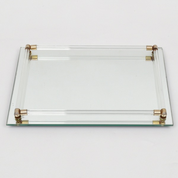 • Bandeja retangular espelhada, base em placa plana com bordas lapidadas, apoiada sobre quatro pés metálicos circulares. Estrutura superior composta por galerias laterais formadas por hastes tubulares paralelas em vidro, fixadas por suportes metálicos nos cantos, em metal dourado. Montagem por elementos metálicos rosqueados, visíveis na face inferior. Medidas: