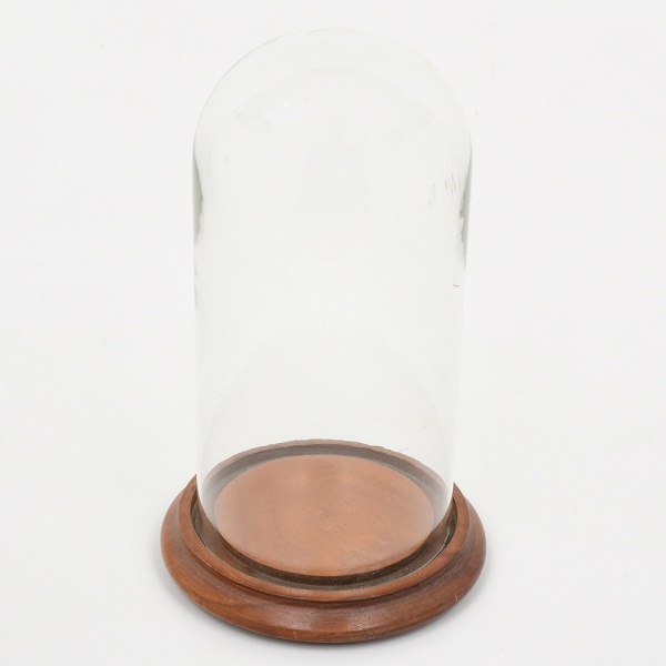 • Redoma em vidro com base em madeira torneada; cúpula cilíndrica com topo arredondado, base circular escalonada com rebaixo para encaixe da redoma. Medidas: