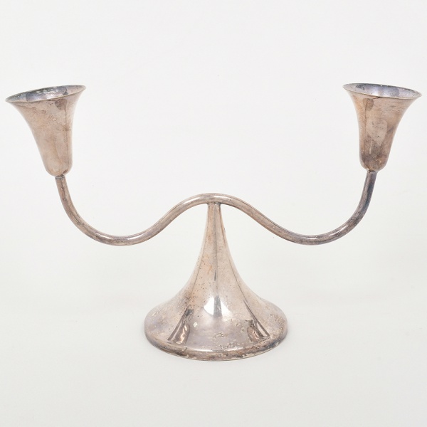 • WOLFF. Castiçal de dois lumes em metal prateado, com base cônica e braços laterais curvos simétricos terminando em bocais campaniformes. Marca da manufatura puncionada ao fundo. Necessita refazer banho de prata. Medidas: Alt.: x Comp.: x Larg.: