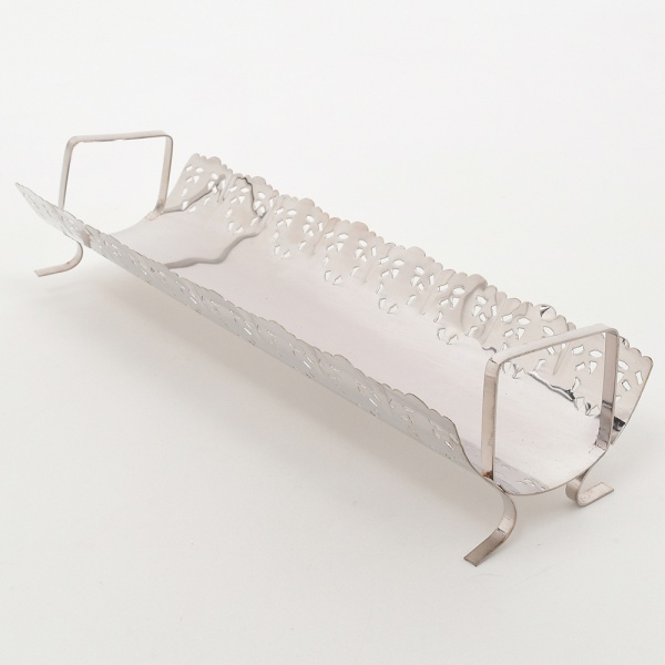 • Travessa retangular em metal prateado, conformação e recorte vazado; corpo alongado curvado e laterais elevadas com borda recortada em padrão vazado com motivos repetitivos, extremidades  alças e pés integrados. Medidas: