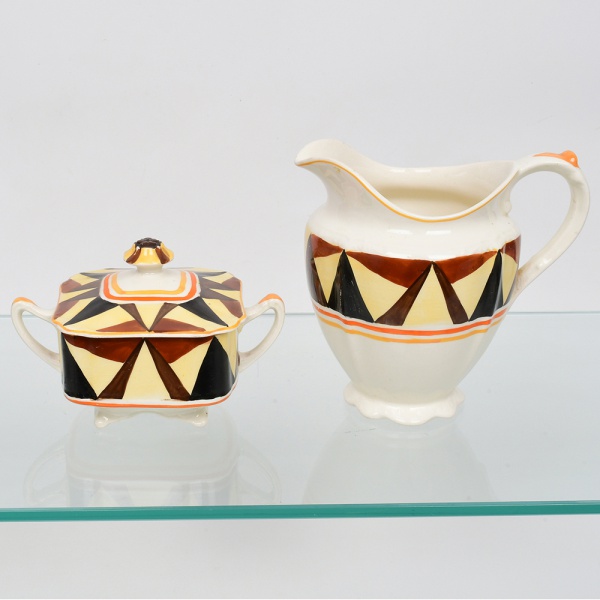 • J & G Meakin, Staffordshire - Inglaterra(Fundada em 1851). Uma(01) leiteira e um(01) açucareiro em faiança inglesa da década de 1930, padrão "SOL"; esmaltação de tom marfim, dotado de rica decoração Art Déco, contendo composição geométrica radial, formada por reservas triangulares alternadas em esmalte de tonalidade preta, marrom e amarelo-creme, dispostas em sequência contínua, bojo circundado por frisos concêntricos em tom laranja e mostarda, este último se replica no contorno da borda da tampa. Marca da manufatura no verso. Medidas: Leiteira: Alt.: 14,5 x Comp.: 16 x Larg.: 11 cm; Açucareiro: Alt.: 9,5 x Comp.: 14,5 x Larg.:  9 cm.