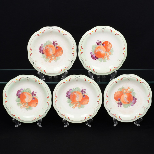 • Conjunto de seis(06) pratos para pão, ou doce, em faiança, de formato circular com aba levemente recortada em ondulações suaves e cavidade central côncava. Decoração central representando composição de frutas(pêssegos, uvas e bagas) dispostas sobre folhagem, executada por transferência e pintura complementar. Aba ornada por filetes curvos em esmalte vermelho, intercalados por pequenos elementos geométricos em amarelo e traços pontilhados em preto, compondo motivo estilizado. Marca da manufatura no verso. Um com acentuada quebradura no verso da borda, um com pequeno bicado, todos com leves manchas do tempo e marcas de uso. Medida: Diam.: 19 cm.
