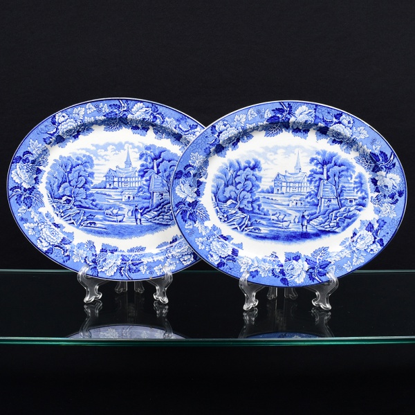 • Wood & Sons, Burslem - Inglaterra(Fundada em 1865). Duas(02) travessas ovais em faiança inglesa da década de 1920. Esmaltagem vítrea na cor branca, profusa decoração na técnica "blue and white", intitulada 'English Scenery', com paisagem campestre contendo casario, personagens e igreja ao fundo, orla circundada por flores e folhagens, borda contornada por friso na tonalidade cobalto. Marca da manufatura no verso. Medidas.: Comp.: x Larg.: