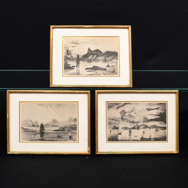 • Três(03) gravuras em preto e branco, representando vistas litorâneas com embarcações, enseadas e formações montanhosas, remetendo à paisagem da Baía de Guanabara, no Rio de Janeiro. Acondicionadas em molduras de madeira com acabamento dourado, acompanhadas de paspatur. Medidas: Comp.: x Larg.: