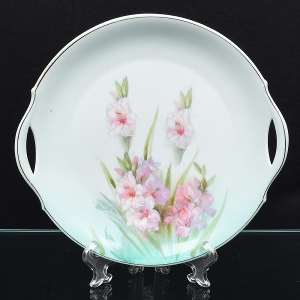 • Travessa em porcelana alemã de formato circular com aba larga e duas alças vazadas laterais integradas à borda. Esmaltação branca, centro decorado com pintura floral policroma, representando hastes com flores em tons de rosa e folhas em verde, executada na técnica de decalque com realces pintados à mão. Aba com filete discreto. Verso com marca de manufatura Bavaria, indicando produção alemã. Medida: Diam.: