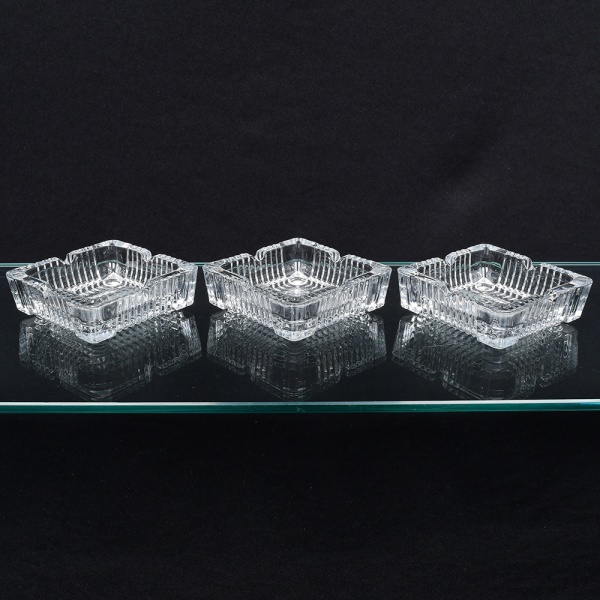 • Conjunto de três(03) cinzeiros em cristal moldado, translúcido e incolor; formato quadrangular com bordas recortadas e cavidades nos vértices para apoio do cigarro, paredes com relevo vertical repetitivo e base espessa. Medidas: