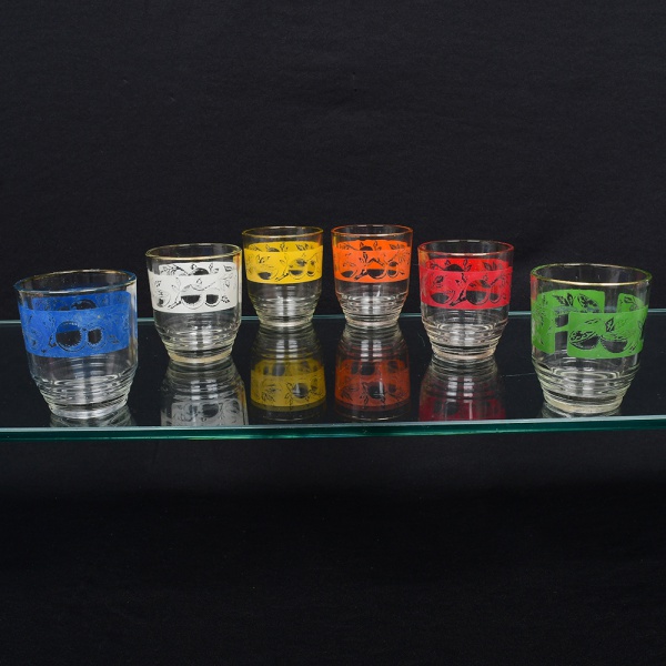 • Conjunto composto por seis(06) copos em vidro transparente, de formato cilíndrico levemente afunilado, decorados com faixa colorida em policromia aplicada por serigrafia, apresentando motivo de frutos estilizados. Medidas: