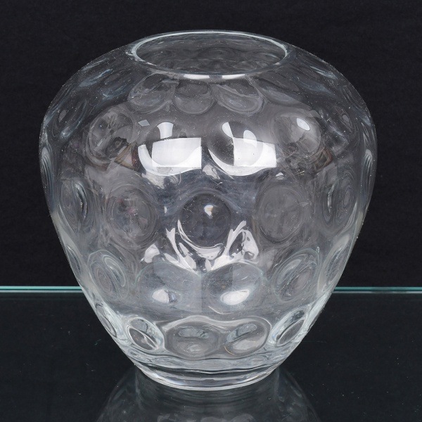 • Vaso em vidro incolor, de corpo globular com boca circular ampla e borda levemente espessada. Superfície interna com decoração em relevo moldado, composta por depressões circulares repetidas (padrão tipo bolhas/lentes), distribuídas de forma regular por toda a parede.  Peça obtida por prensagem em molde. Medidas: