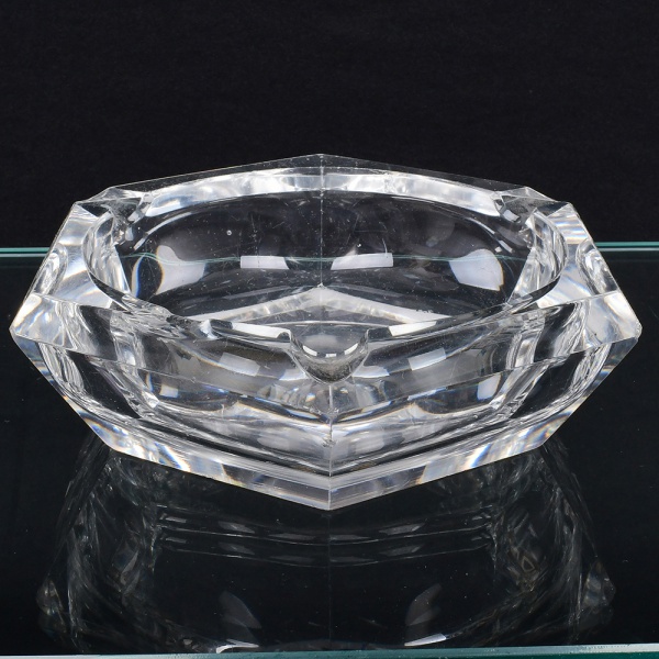 • Cinzeiro em cristal incolor, de formato poligonal com bordas facetadas e espessura acentuada, apresentando quatro apoios para cigarro distribuídos na borda e cavidade central profunda. Medidas: