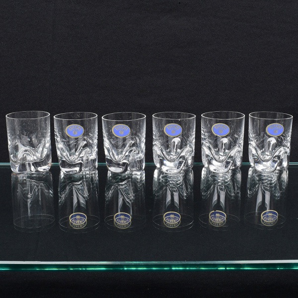 • BOHEMIA. Conjunto de seis(06) copos em cristal prensado, corpo cilíndrico e base espessa com relevo moldado em ondulações, marca aplicada em etiqueta. Medidas: