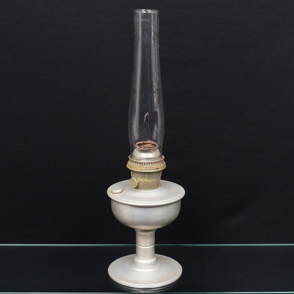 • Lamparina de mesa a querosene, composta por base e reservatório em metal, queimador em latão e chaminé em vidro incolor da manufatura Alladim. Corpo com fuste central e base circular. Queimador com regulador lateral e galeria perfurada. Chaminé cilíndrica alongada, encaixada em colar metálico. Apresenta sinais de oxidação. Medidas: