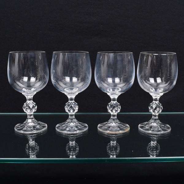 • Conjunto de taças, para vinho, em cristal, diáfano e incolor, bojo liso, fuste em anel intermediário multifacetado, apoiado sobre base circular moldada com sulcos verticais. Composto de quatro unidades. Medidas: