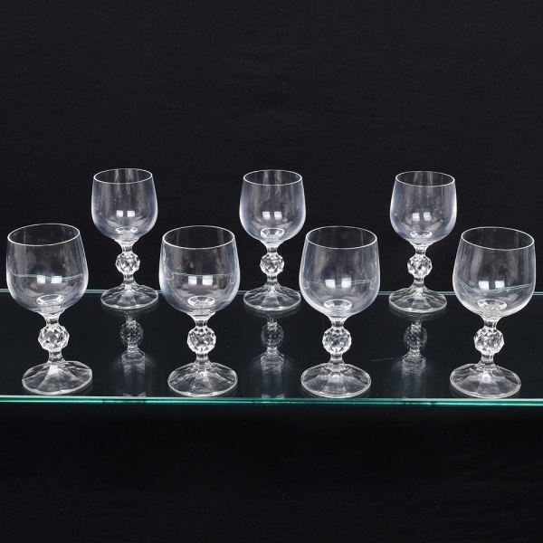 • Conjunto de taças, para licor, em cristal, diáfano e incolor, bojo liso, fuste em anel intermediário multifacetado, apoiado sobre base circular moldada com sulcos verticais. Composto de sete(07) unidades. Medidas: