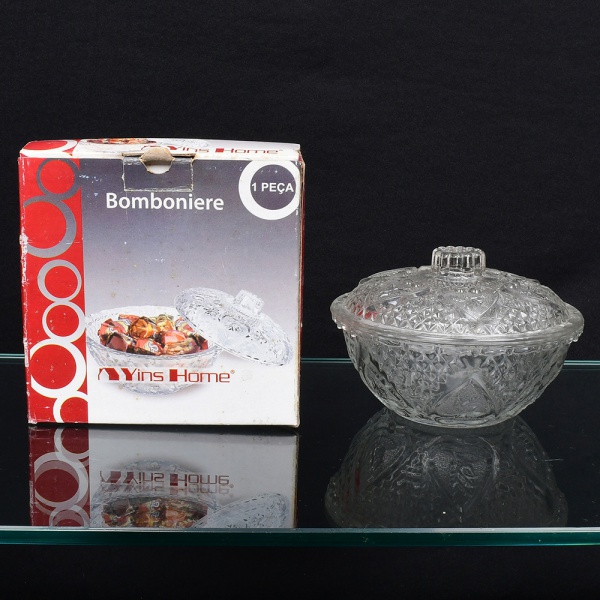 • Bomboniere em vidro incolor prensado, composta por bojo hemisférico com paredes espessas e tampa sobreposta com pega superior em forma de botão. Superfície externa integralmente decorada em relevo geométrico facetado, com padrões losangulares e elementos triangulares repetitivos. Acompanha caixa original do fabricante Yins Home. Medidas: