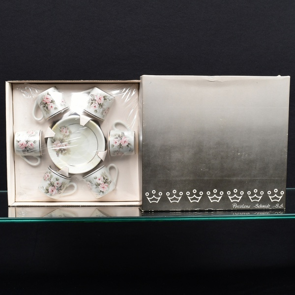 • Conjunto para café em porcelana, composto por seis(06) xícaras com alças laterais e pires correspondentes, acondicionado em embalagem original; decoração floral aplicada por transferência (decalque) sob vidrado, representando flores em tons de rosa e folhas em verde, distribuídas nas paredes externas das xícaras e nos centros dos pires. Bordas com filete em douradura. Acondicionado em caixa com berço interno moldado e proteção plástica. Tampa com identificação do fabricante Porcelana Schmidt S.A..