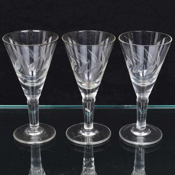 • CRISTAIS HERING. Conjunto de taças para licor em cristal, diáfano e incolor, bojo obcônico talhado com folhagens estilizadas, fuste tubular sobre base circular. Composto de dez(10) unidades. Acondicionadas em embalagem original. Medidas: Alt.: 10,5 x Diam.: 5,5 cm.