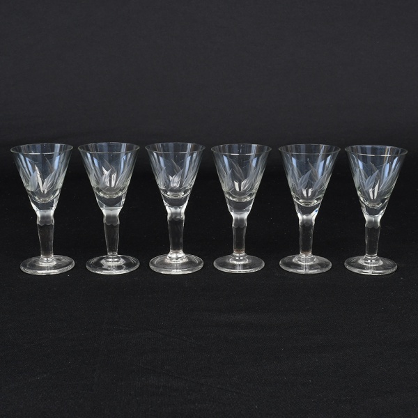 • Conjunto de taças de pé alto em cristal para licor, diáfano, levemente azulada, bojo obcônico talhado com folhagens estilizadas dispostas em faixas horizontal, fuste tubular de topo facetado, base circular. Composto de seis(06) unidades. Medidas: Alt.: 10,5 x Diam.: 5 cm.