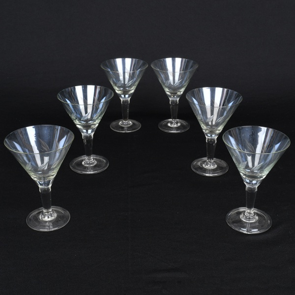 • Conjunto de taças de pé alto em cristal para champanhe, diáfano, levemente azulada, bojo obcônico talhado com folhagens estilizadas dispostas em faixas horizontal, fuste tubular de topo facetado, base circular. Composto de seis(06) unidades. Medidas: Alt.: 14,5 x Diam.: 10 cm.