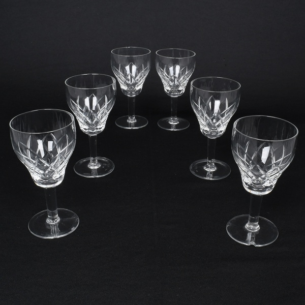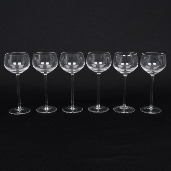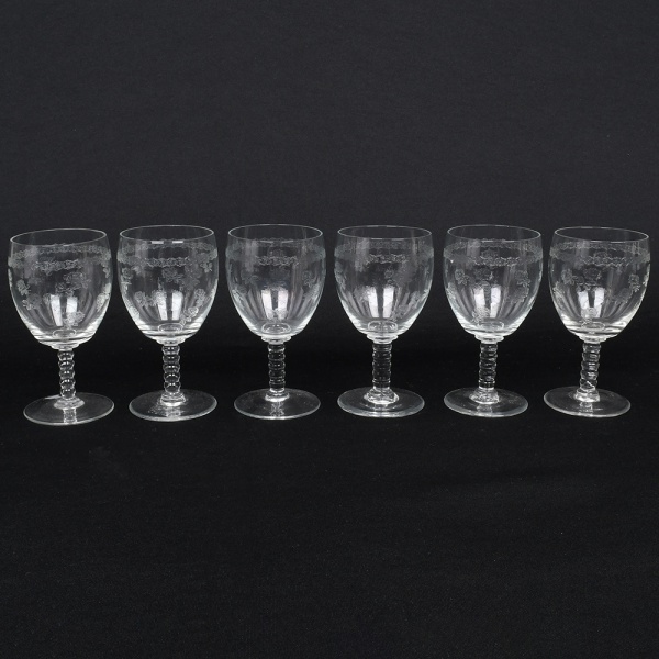 • Conjunto de taças em cristal, para vinho tinto, diáfano e incolor, bojo oval ricamente gravado com composição de motivos florais e friso contínuo próximo à borda, haste composta por segmento torneado em anéis sobrepostos, base circular. Composto de seis(06) unidades. Medidas: Alt.: 12,5 x Diam.: 6,5 cm.
