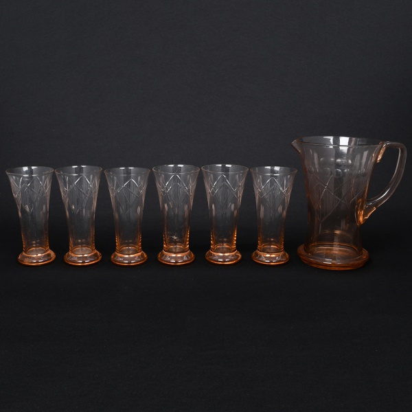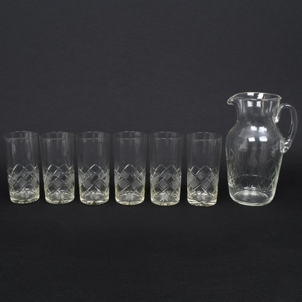 • Seis(06) itens: a) Conjunto de copos em cristal, diáfano e incolor, bojo cilíndrico decorado por lapidação geométrica combinando motivos losangulares entrecruzados, com reservas em padrão quadriculado pontilhado e facetas angulares, dispostas em faixa contínua. Composto de seis(06) unidades. Medidas: ;b) Jarra em meio cristal incolor, corpo de perfil balaústre, talhado com sulcos que formam padrão de losangos e folhagens estilizadas, bico vertedor ondulado e revirado para fora, alça lateral curvada aplicada sobre a superfície. Medidas: